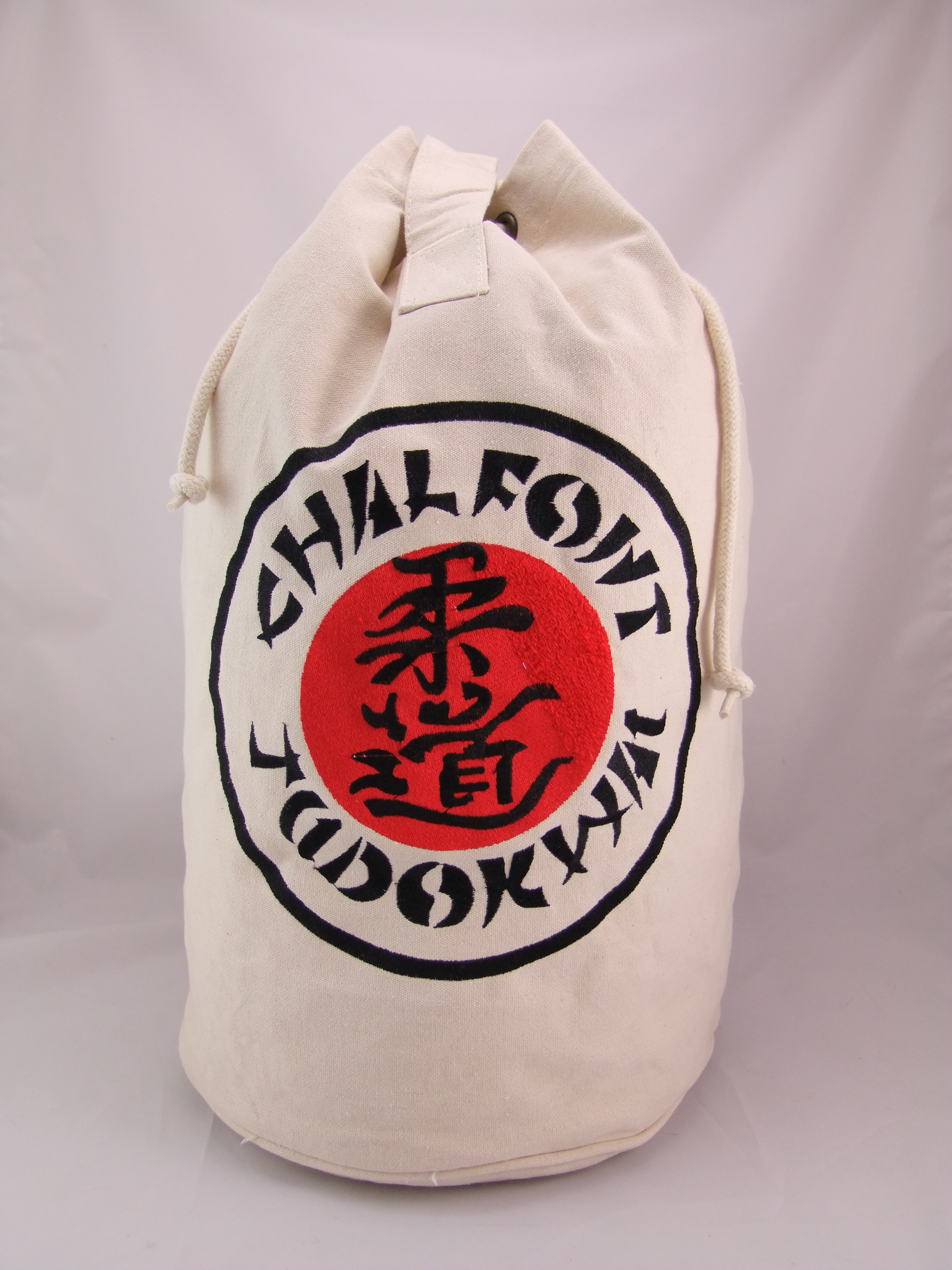 A tough plastic 'canvas' effect bag large enough to hold a Judogi and Zoori for a Primary or Junior up to around 5 foot high. Features draw cord closure that is attached at both bottom corners so that it can be carried 'rucksack' style. Large Chalfont Judokwai badge on one side to show your allegiance.